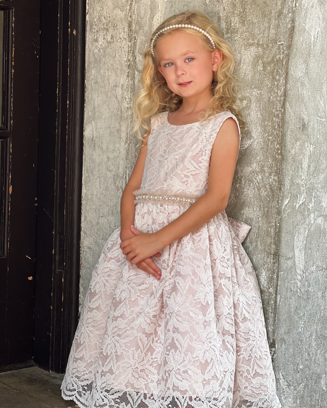 All Lace Girls Dress with V Back & Bow and Mesh Pearl Trim