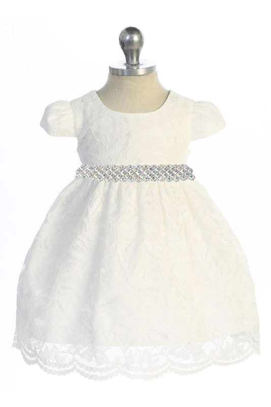 All Lace Baby Dress with V Back & Bow and Thick Rhinestone Trim