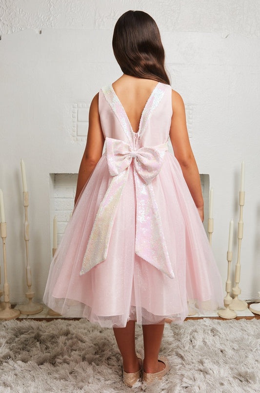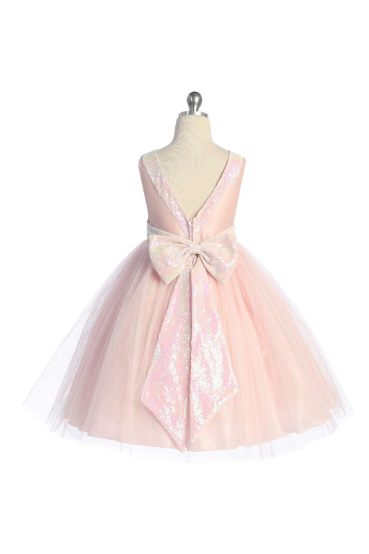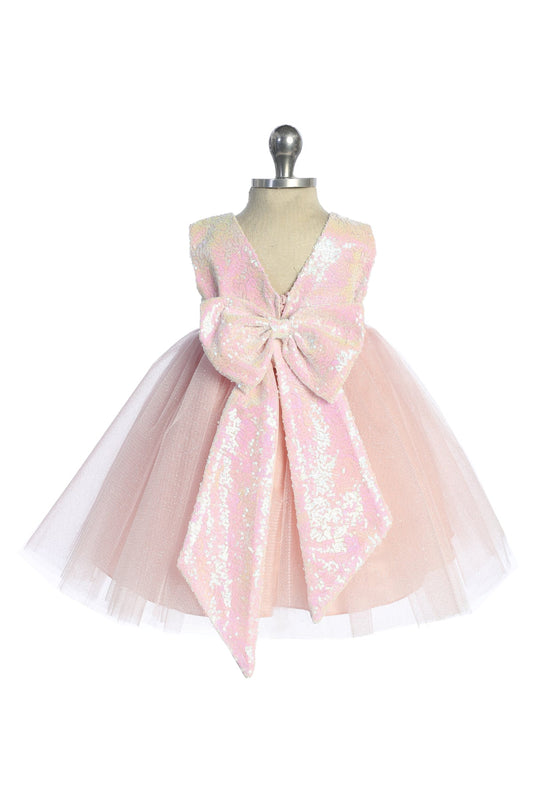 Pink/Iridescent Sequins V Back & Bow Girls Dress