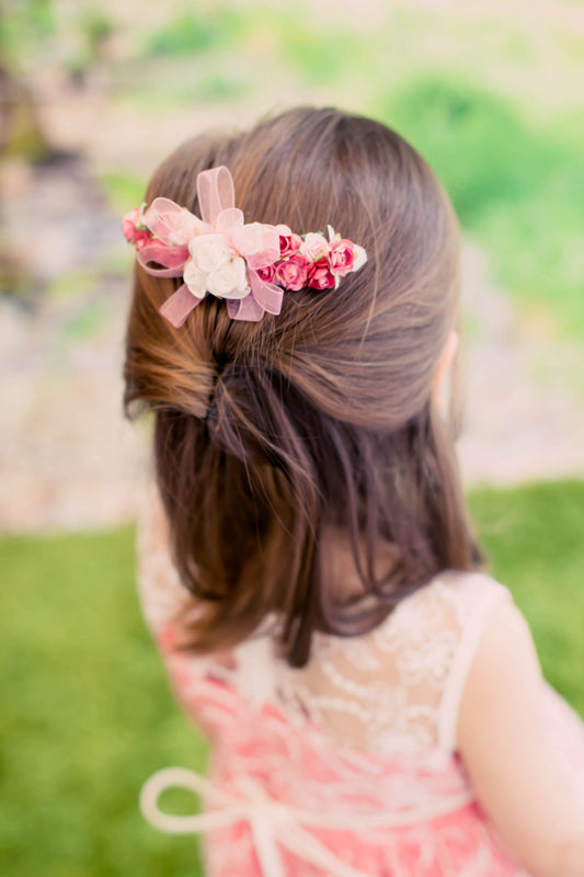 Capped Sleeve Satin & Tulle Girls Dress with Floral Trim