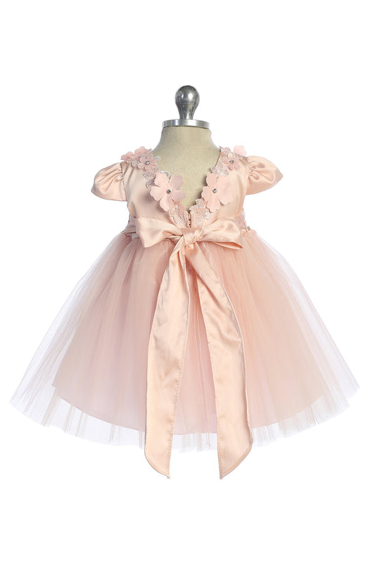 Capped Sleeve Satin & Tulle Baby Dress with Floral Trim