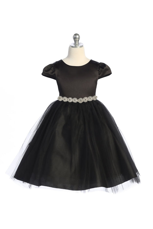 Capped Sleeve Satin & Tulle Girls Dress with Braided Rhinestone Trim