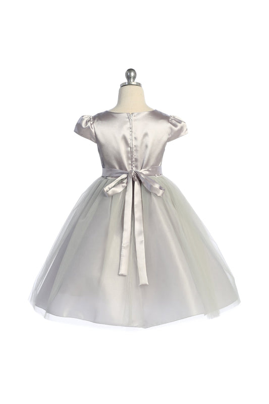 Capped Sleeve Satin & Tulle Girls Dress with Floral Trim
