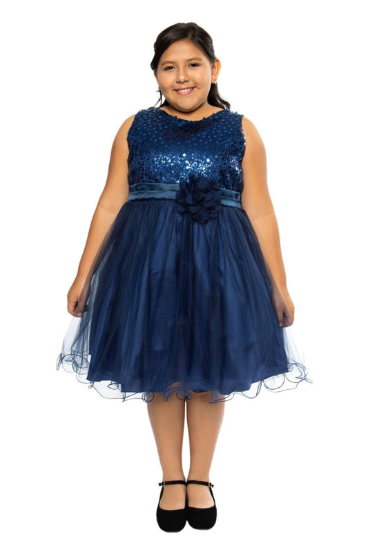 Sequin Party Plus Size Girls Dress with 3D Mesh Flower and Sash