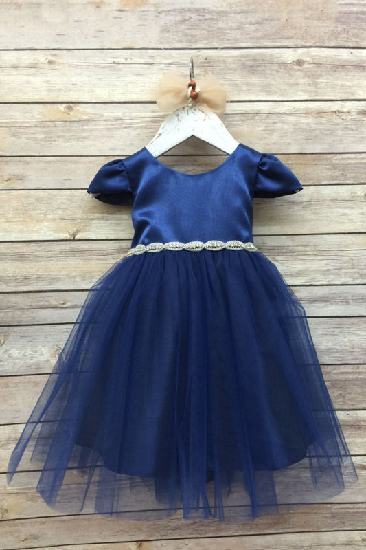 Regina Satin & Tulle Baby Dress with Capped Sleeves and Swirl Rhinestone Belt