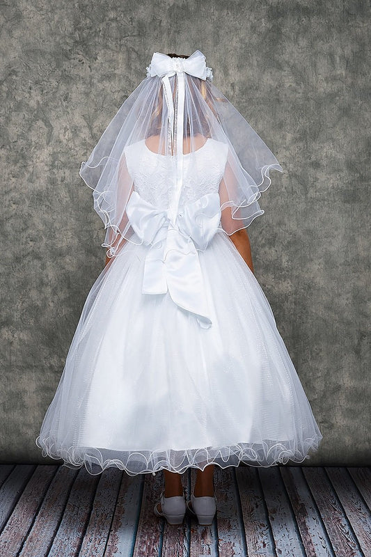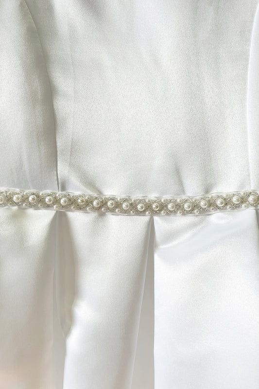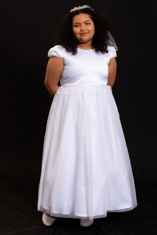 Long Satin Pearl Trim Girls Communion Dress with Plus Sizes