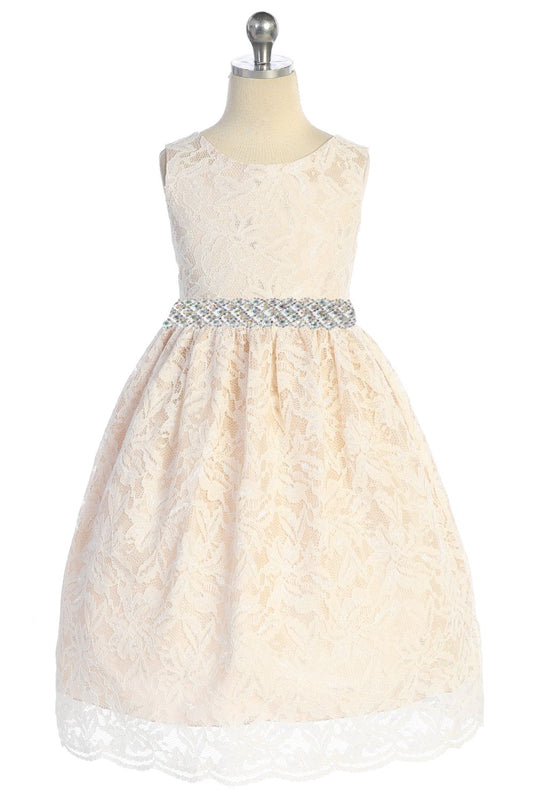 All Lace Girls Dress with V Back & Bow and Thick Rhinestone Trim