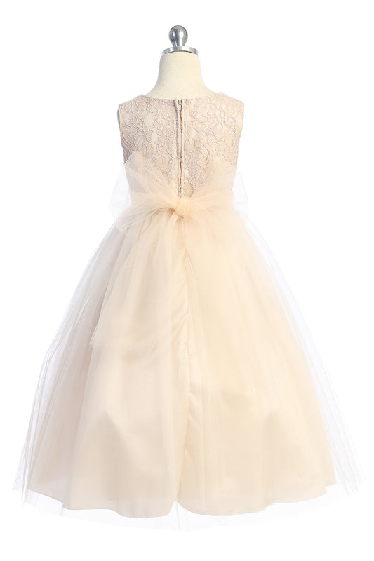 Long Lace Illusion Girls Dress with Thick Pearl Trim