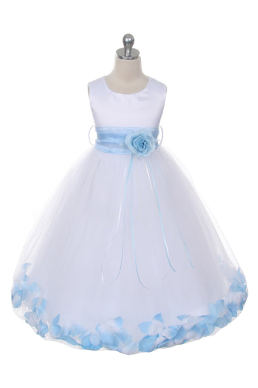 White Satin Flower Petal Girls Plus Size Dress with Organza Sash