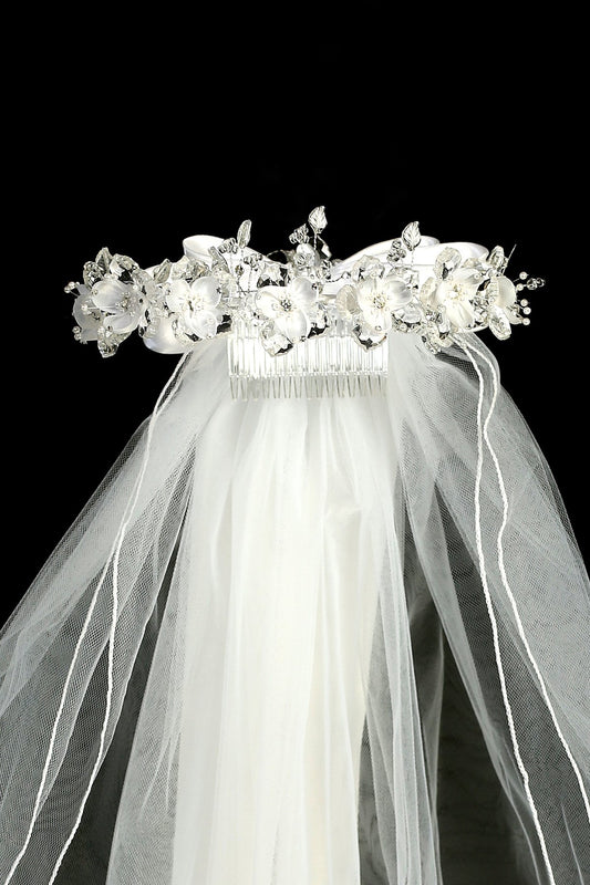 Flower Crown Veil with White Faux Flowers & Rhinestone