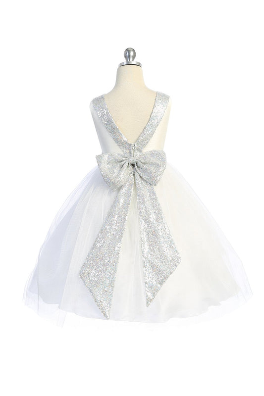 Ivory/Silver Sequins V Back & Bow Girls Dress