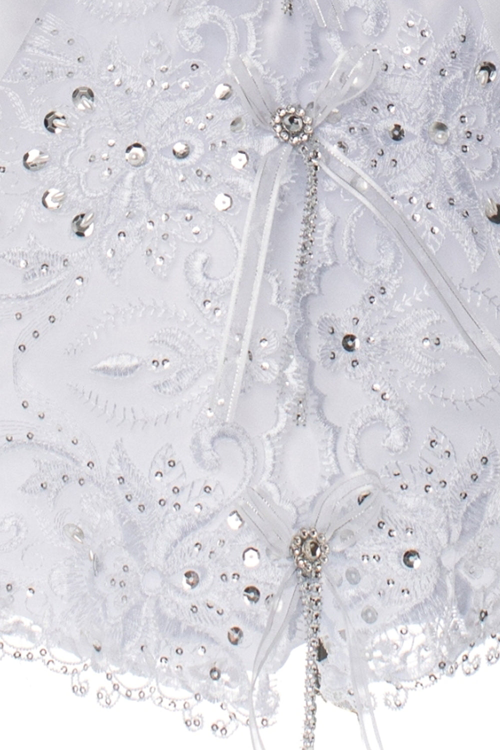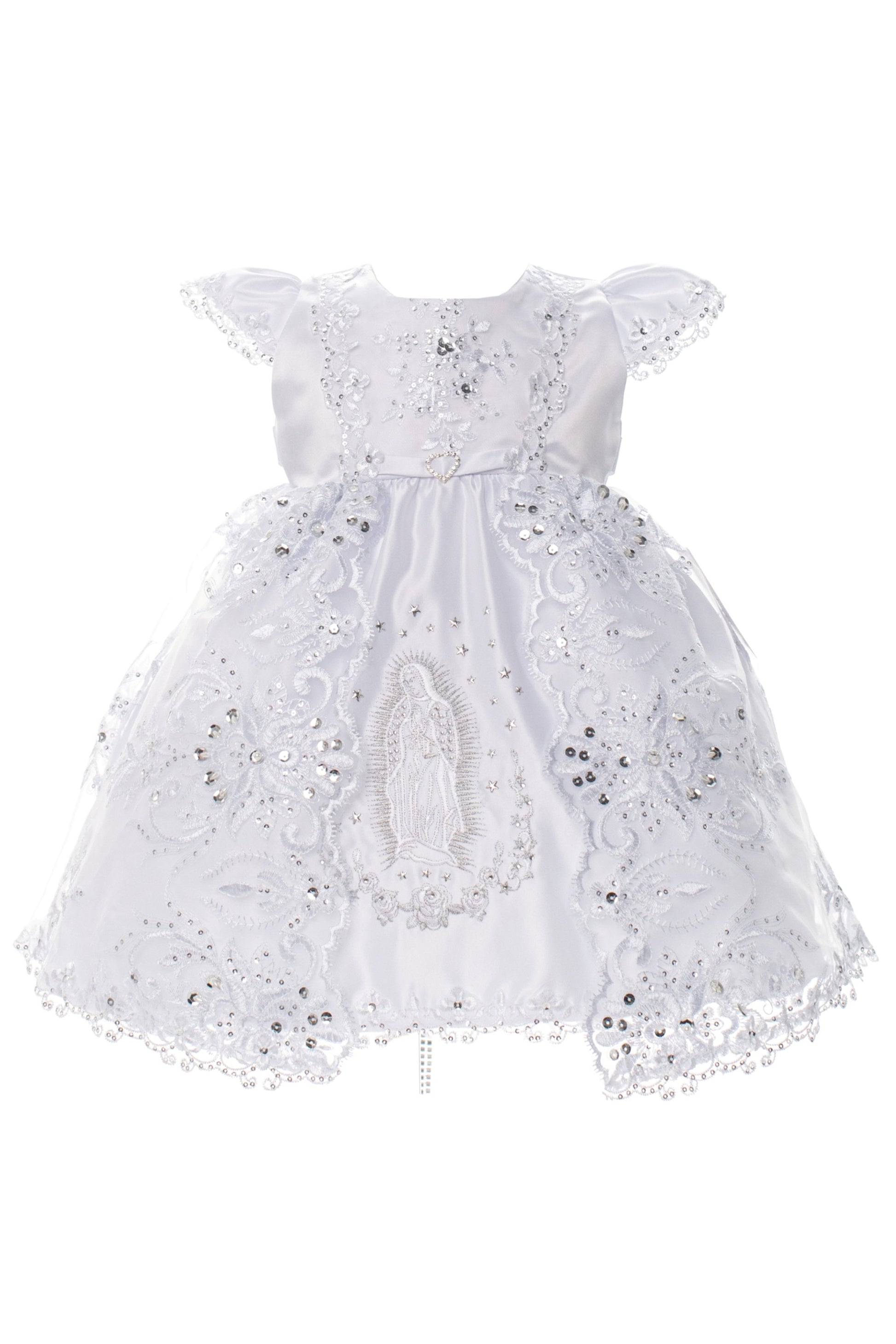 Celebrate her special day with this extravagant baptism dress for baby girls, thoughtfully designed with timeless beauty and delicate details. The satin bodice and skirt features sequins & pearls atop embroidered foliage patterns, and the waist is adorned with a cute rhinestone heart belt. A beautifully embroidered Virgin Mary is centered on the front of the skirt, adding a meaningful and graceful touch to this cherished garment. Short capped sleeves create a classic silhouette.