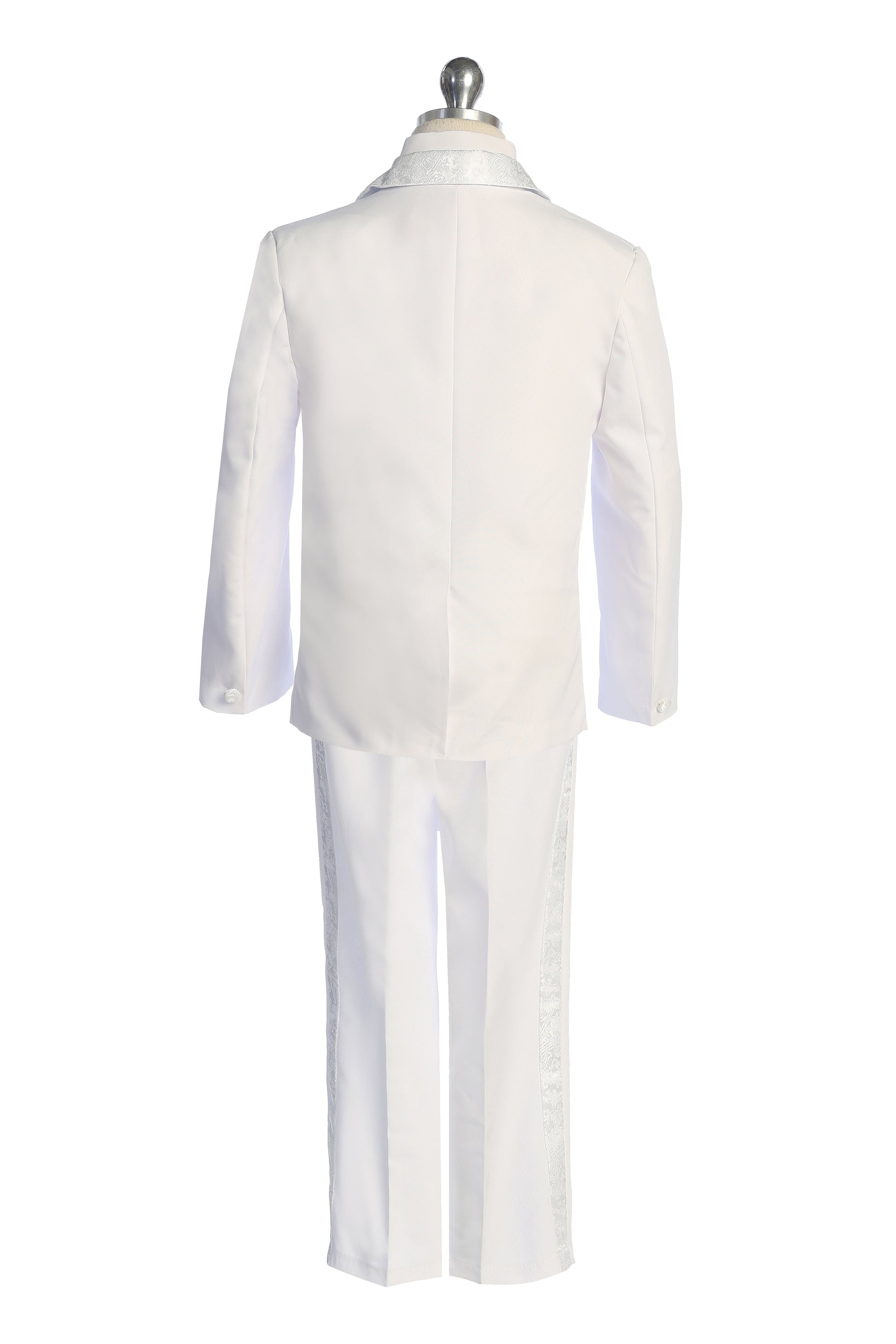 Make every special occasion unforgettable with this 5-piece boys' tuxedo set. Featuring intricate brocade detailing on the wingtip collar, vest, and bow tie, this ensemble offers a sophisticated, polished appearance.