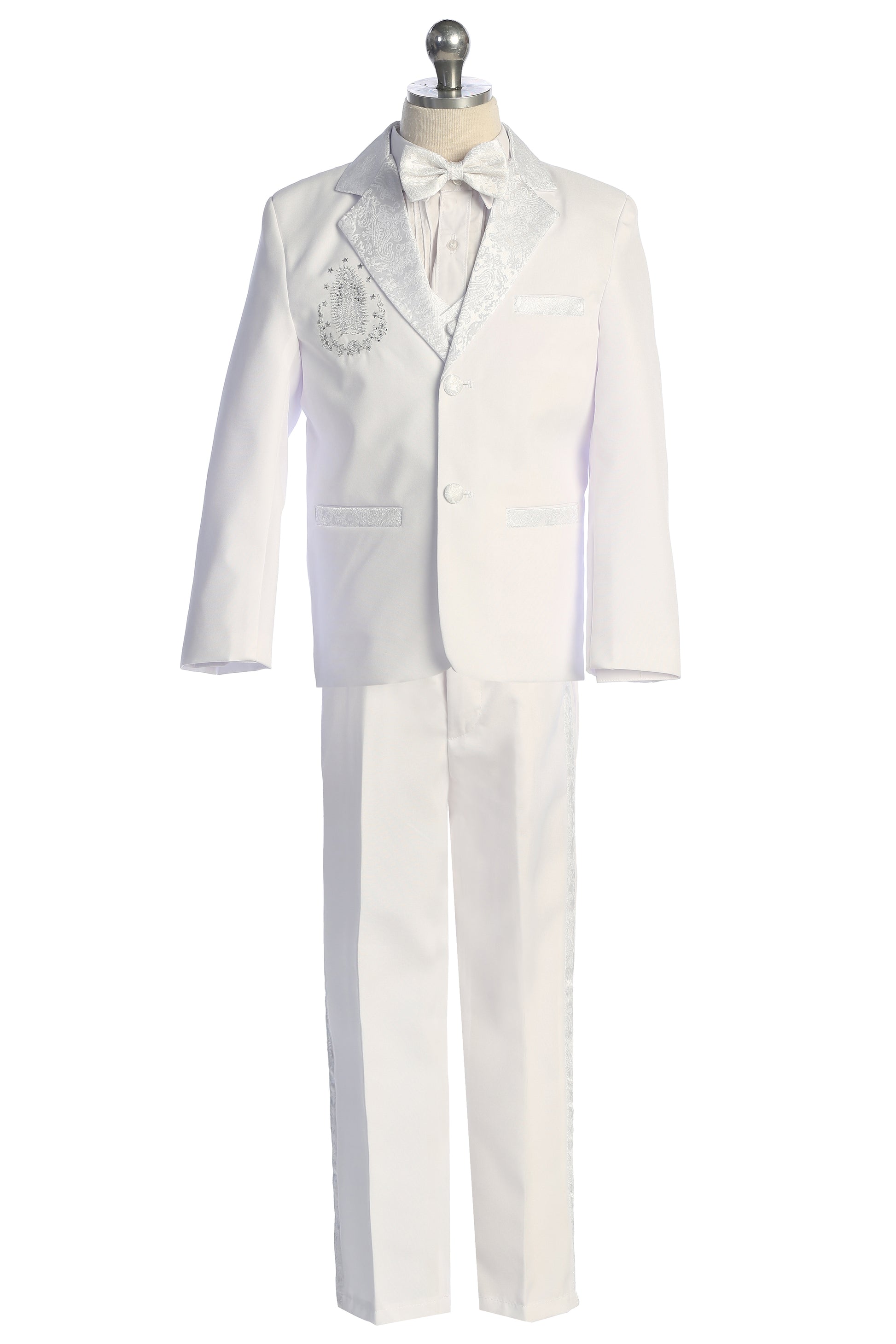 Six-Piece White Brocade Tuxedo Set with Virgin Mary Accents for Baby Boys